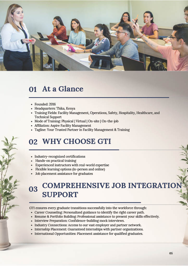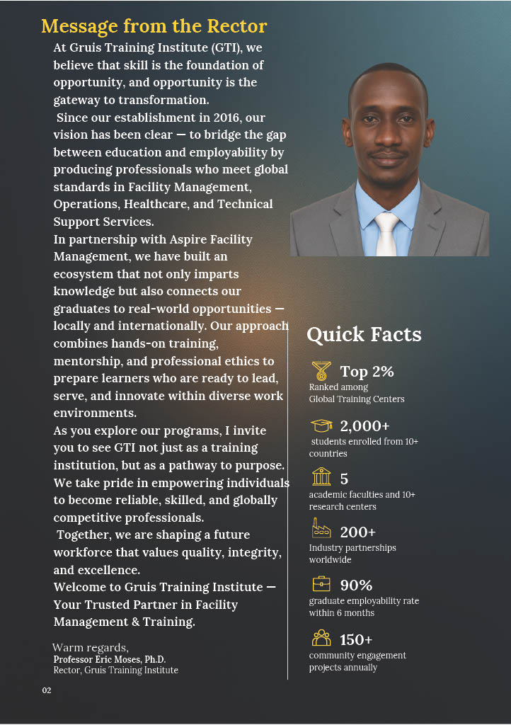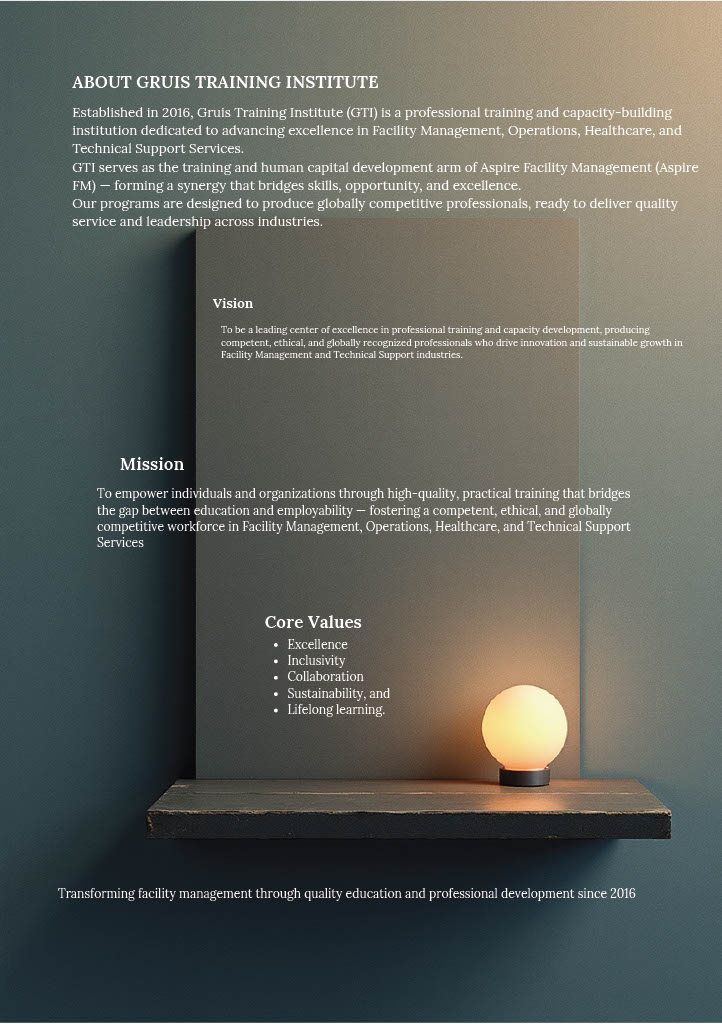 Founded in 2016, Gruis Training Institute is a professional training and capacity-building institution dedicated to transforming the Facility Management sector through innovative, practical and industry-driven training.